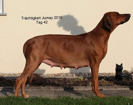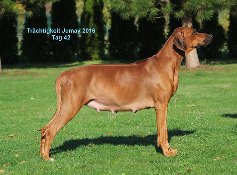 Die Entwicklung der Embryos ist abgeschlossen, auch die Behaarung und Krallen ist nun vollständig entwickelt am Ende dieser Woche... Jetzt müssen die Welpen nur noch wachsen. Wachsen tun sie jetzt noch in etwas 2/3 vom Geburtsgewicht. Die Embryos sind jetzt ca. 4cm groß und müssen noch wachsen auf über 18cm. Also in den nächsten 3 Wochen eine enorme Leistung vollbringen. Jumay bekommt ab dieser Woche leichtere Mahlzeiten, aufgeteilt über den Tag, hochwertig und gehaltvoll. Bewegen werden wir sie weiterhin, halt ohne größere Anstrengungen. Ruhige, lange Spaziergänge.