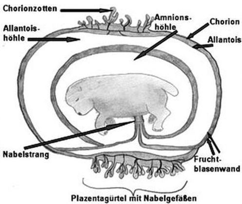- Aus der äußeren, dem Uterusmuskel zugewandten Schicht (Ektoderm) entwickeln sich Nervensystem, Sinnesorgane und Haut.